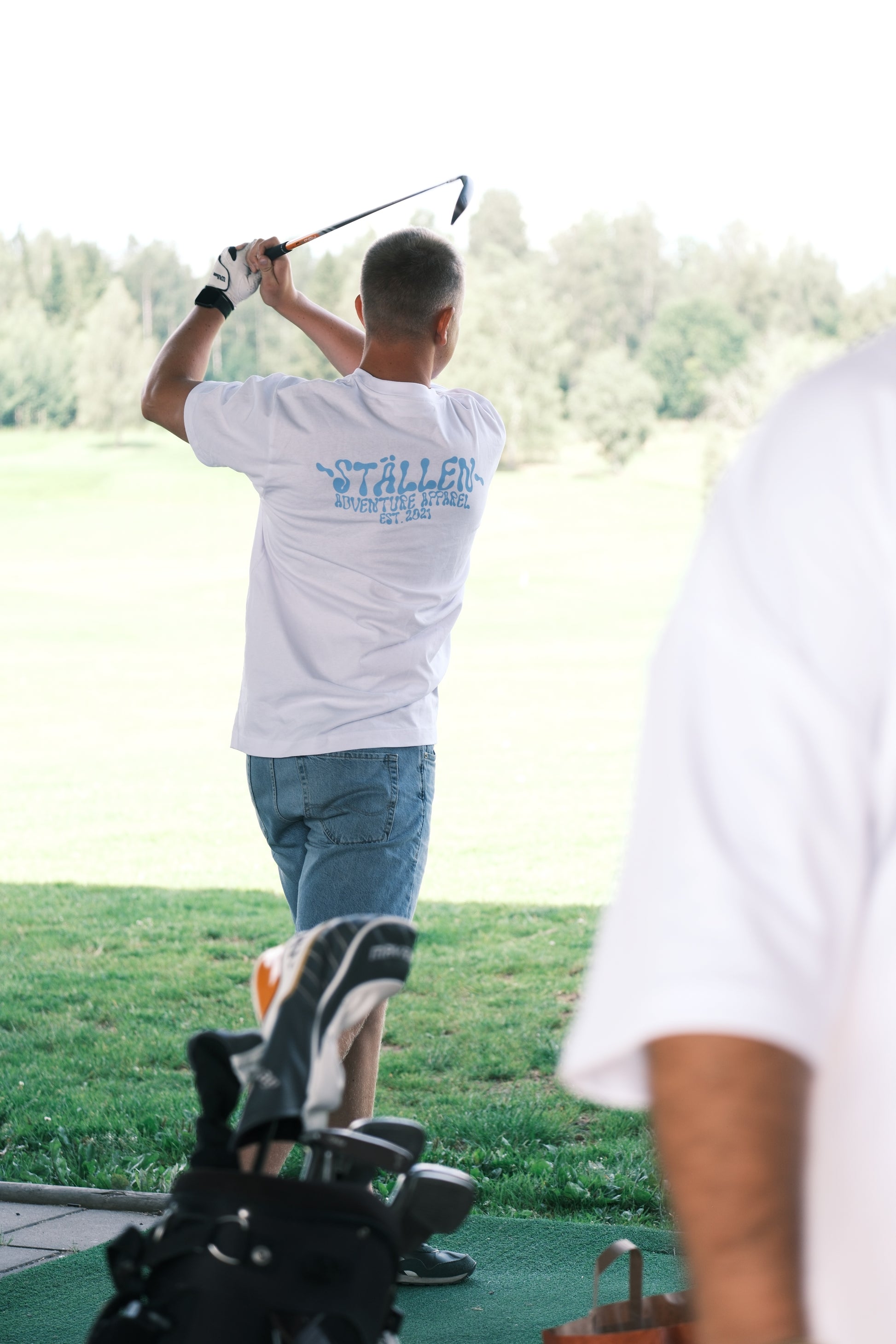 Minimal front, bold back – pin logo on the chest, Ställen graphic on the back